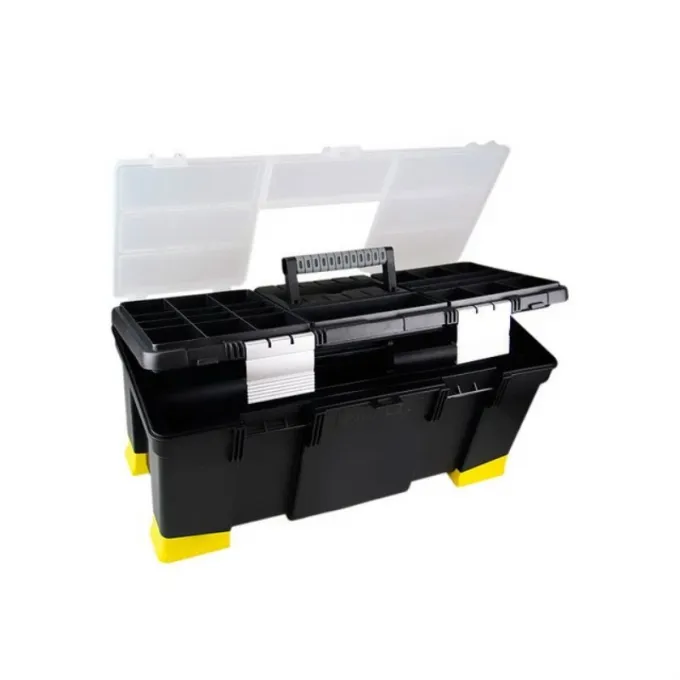 Caixa em plástico pp (polipropileno); organizador transparente para armazenamento de peças pequenas; trava dupla de alumínio; alça emborrachada; bandeja interna removível com régua; estrutura diferenciada, com vários pontos de reforço no interior da caixa, o que garante a melhor entrega dentre os organizadores plásticos.