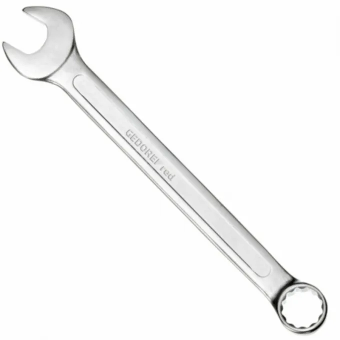 Aço Gedore-Vanadium. Acabamento niquelado e cromado. Chave combinada com um lado boca e outro Unit Drive com as mesmas medidas. A Unit Drive proporciona uma distribuição uniforme da força aplicada na parte central do sextavado, não havendo deformação dos cantos das porcas e parafusos. Inclinação em relação ao corpo: boca 15º e Unit Drive 15º. Parede fina.