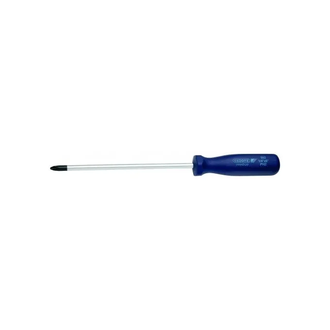 Haste em aço Gedore-Vanadium e cabo em polímero na cor azul padrão Gedore. Haste com acabamento niquelado e cromado, com ponta escurecida. Cabo ergonômico. Chave com haste redonda e resistente, com perfil de encaixe para parafusos tipo fenda cruzada ¿Phillips¿.
