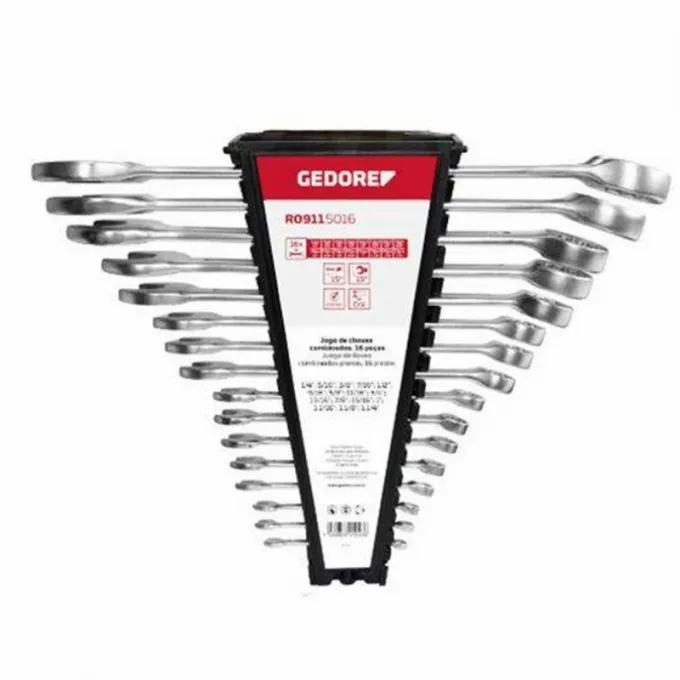 Aço Gedore-Vanadium. Acabamento niquelado e cromado. Chave combinada com um lado boca e outro Unit Drive com as mesmas medidas. A Unit Drive proporciona uma distribuição uniforme da força aplicada na parte central do sextavado, não havendo deformação dos cantos das porcas e parafusos. Inclinação em relação ao corpo: boca 15º e Unit Drive 15º. Parede fina.