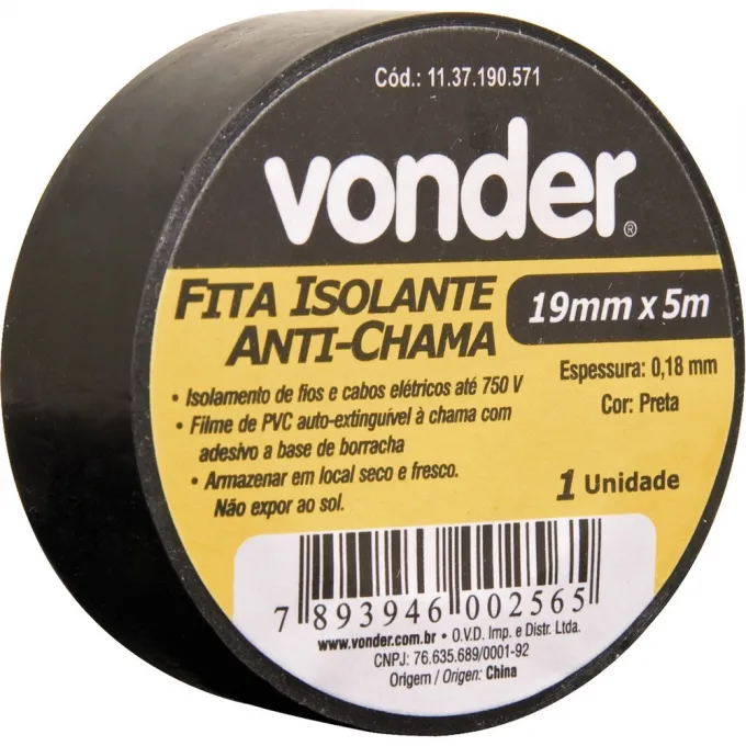 - Aplicações e Dicas de uso: Indicada para isolar fios e cabos elétricos - Caracteristicas Técnicas: Largura x comprimento da fita isolante: 19 mm x 5 m | Material da fita isolante: Filme de PVC com adesivo a base de borracha | Cor da fita isolante: Preta | Espessura da fita isolante: 0,18 mm | Tensão máxima de isolamento da fita isolante: 750 V - Destaques e Diferenciais: Fita antichama com temperatura de trabalho de -10°C até 80°C - Conteudo Bem.Unit.Venda:10 Fita isolante - Garantia: Garantia legal: 90 dias